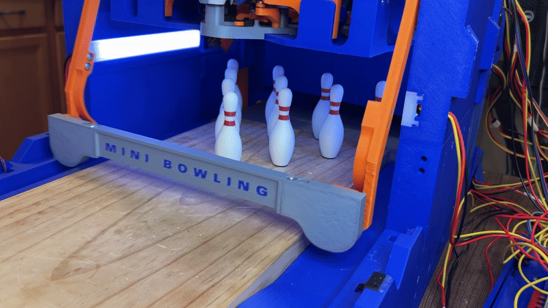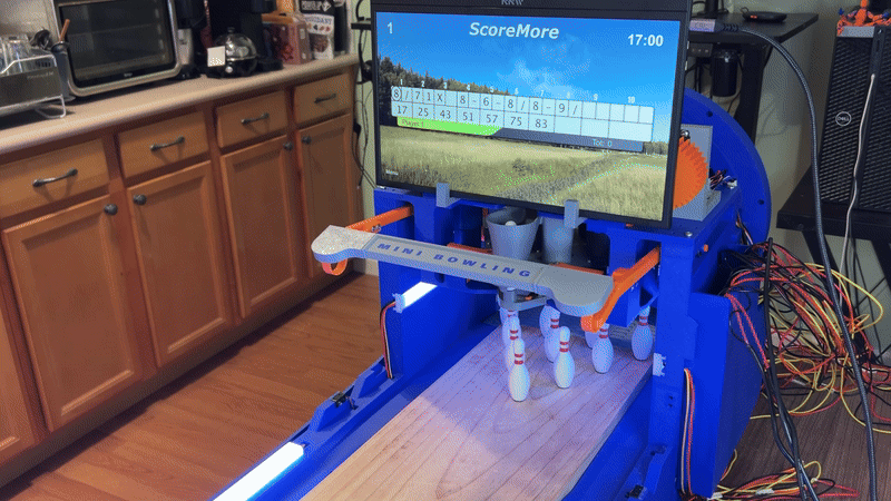 This is a 22% scale, working bowling lane — complete with a real mechanical pinsetter, ball return, camera-based scoring, and animated LEDs — all designed to fit on your table.